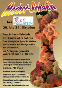In der 2. Woche der Herbstferien (20. bis 24. Oktober) ist wieder Action auf den 64 Feldern des Schachbretts angesagt. Statt Blättern tanzen die Figuren und es geht stürmisch zur Sache.